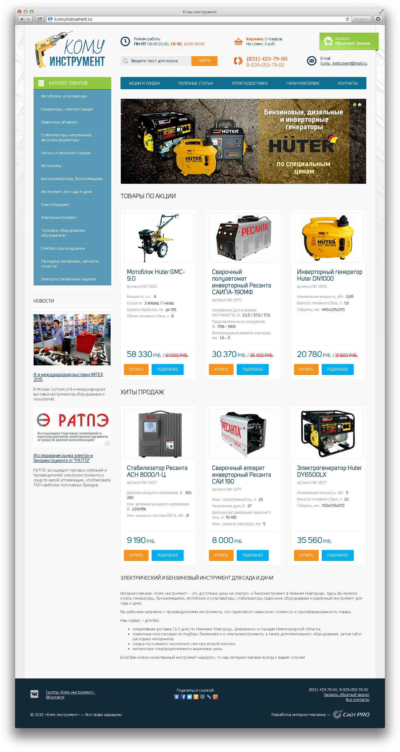 Интернет-магазины Кому инструмент создан в компании «Сайт PRO» в 2015 году. Дизайн сайта разработан в «Сайт PRO». Сайт работает на системе управления Сайт PRO. Заказать интернет-магазины можно на sitepro.pro по цене от 45000 руб.